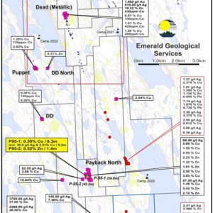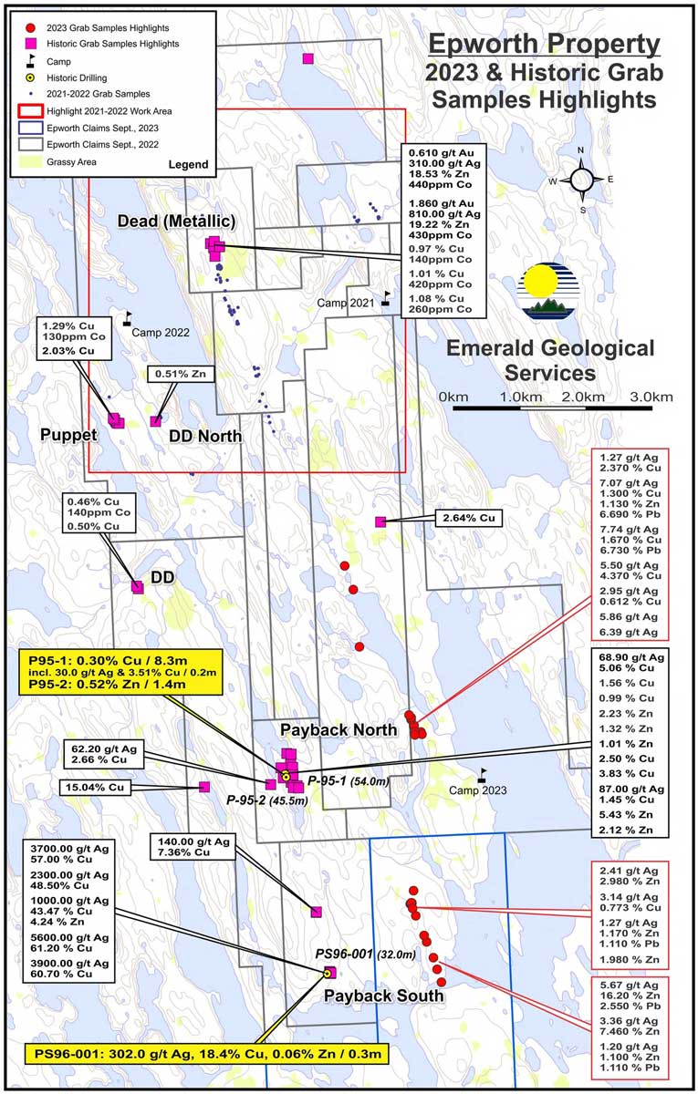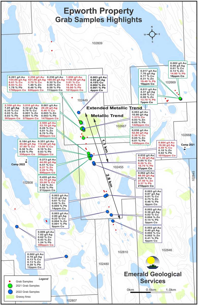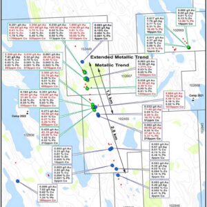 Prospecting programs in the 2020’s have defined several trends in conjunction with historic work. Rock grab samples up to 38% Cu, 1100 g/t Ag, 3.0 g/t Au, 27% Zn, 17% lead along with 1700 ppm Co and other anomalous mineralization define the 2.8 km long “Metallic Trend.” From over 300 total historic rock grab samples, 51 samples yielded over 1% Cu, 29 samples yielded over 30 g/t Ag and 15 samples yielded over 1% Zn. Prospecting and soil sampling have yielded promising new trends and showings such as the new Northeast Showing discovered in 2023 yielding up to 19% Pb and 0.8% Cu in rock grab samples.