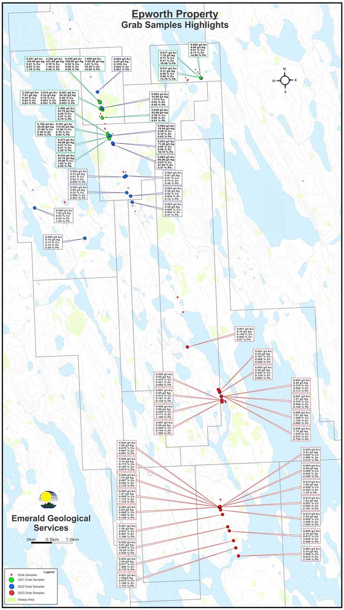 The Epworth Project was explored by Noranda Mining and Exploration in the mid-1990’s, resulting in the discovery of new base metal showings. Prospecting, mapping, geophysics and sparse drilling (only 132m in the original claim block, <2000m total over the newly expanded claims) were conducted over four exploration seasons. The best intercepts yielded 10.4% Cu over 0.9m, 0.3% Cu over 8m, and 18.4% Cu with 302 g/t Ag over 0.3m in very shallow drilling in 1995-6. The Epworth Project has not been drilled since, and no modern geophysical surveys have been conducted.