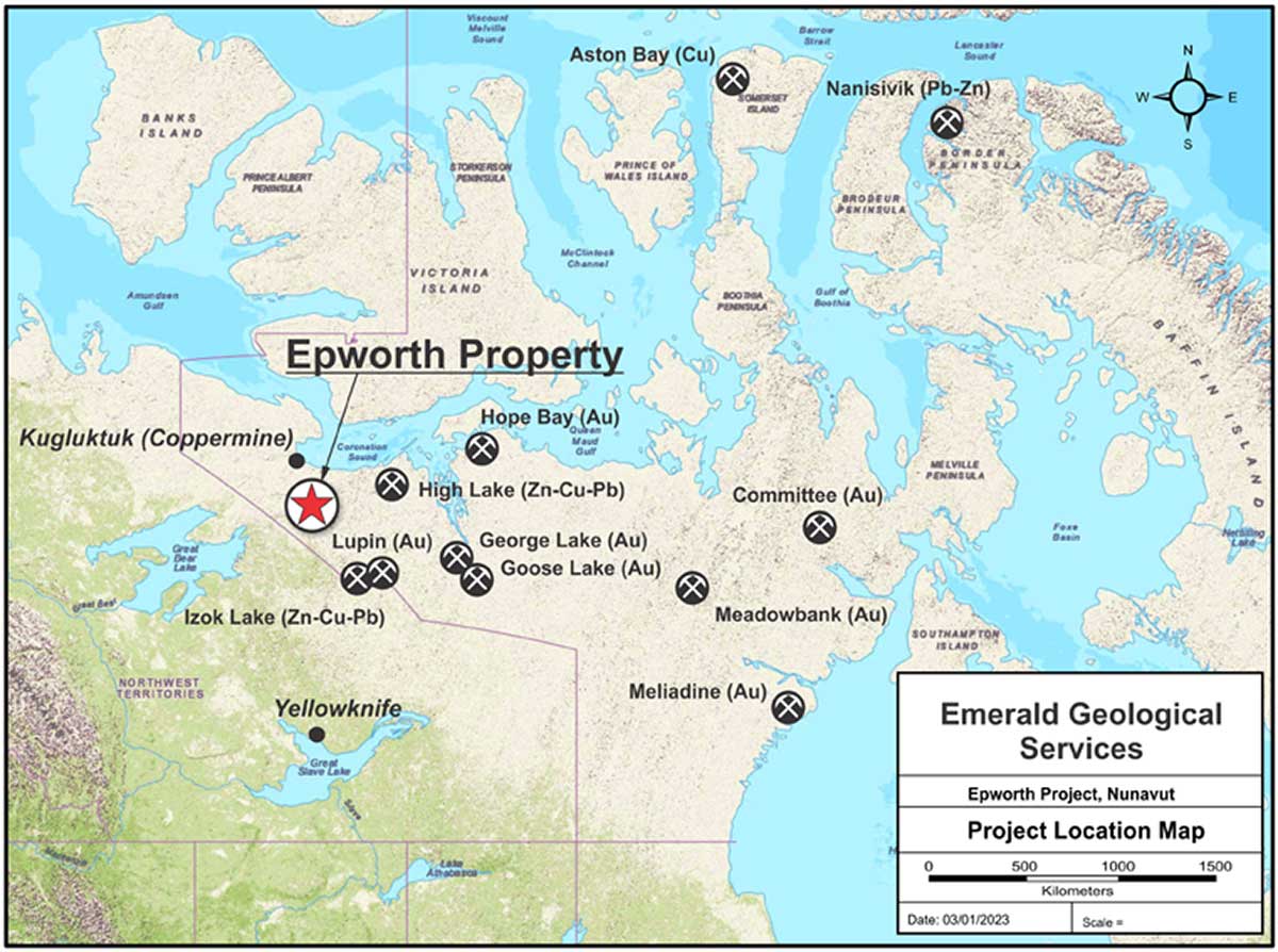 The Epworth Project is located in Nunavut, ~500km north of the city of Yellowknife in the Northwest Territories, and ~80 km south-southeast of the town of Kugluktuk (Coppermine) in Nunavut on the shore of the Coronation Gulf.